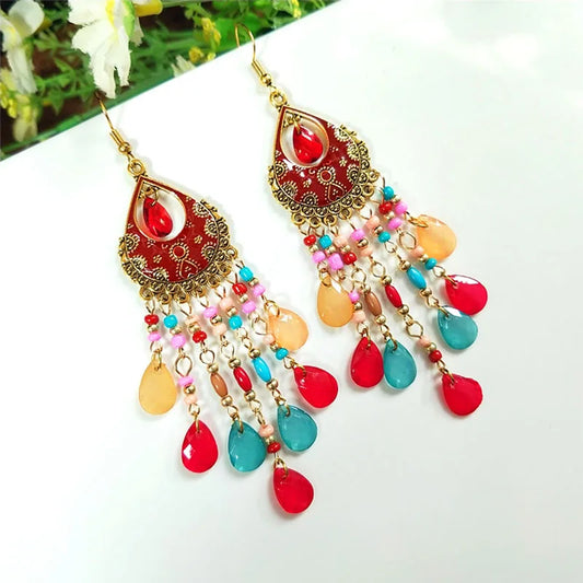 Antique Gold Colour Long Water Drop Tassel Earrings Colourful Dangle Earring Jewellery