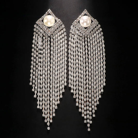 Pearl Long Tassel Earrings With Silver Needle Crystal Rhinestone Sparkling Party Accessories