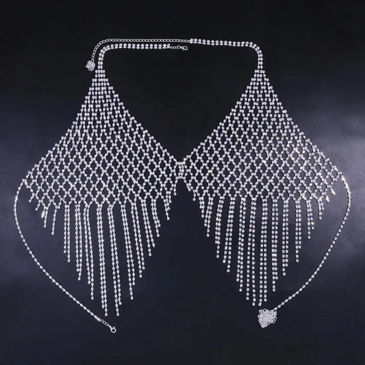XSBODY Mesh Tassels Chest Chain Jewellery Necklace Sexy Lingerie Women Body Luxury Crystal Festival Outfit Bikinis Bras 2024