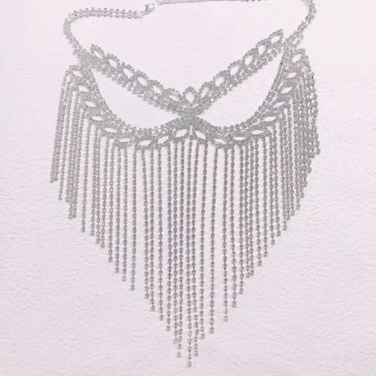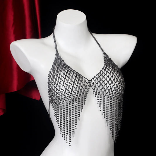 Fashionable Grid Tassels Retro Style Black Rhinestone Chest Chain Nightclub Women's Body Chain Jewelry