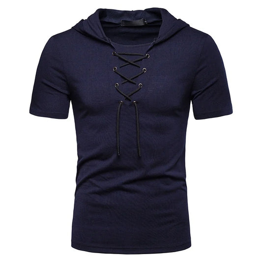New European And American Men's Hooded Loose Tie Up Hip-hop Casual Short Sleeved T-shirt