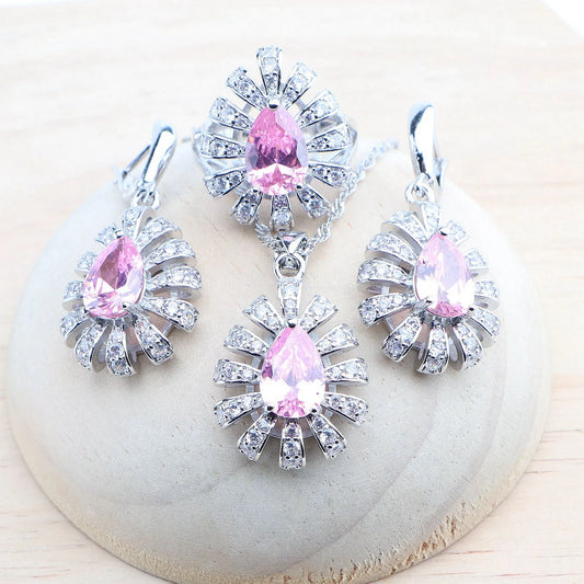 925 Sterling Silver Jewelry Sets Pink Zircon Earrings Rings Wedding Jewelry For Women Stones Bracelets Pendant Necklace Set