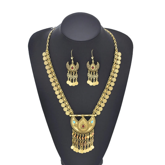 Charms Golden Women Jewelry Sets Bohemian Ethnic Tassel Coins Pendant Necklace Sets Statement Indian Moon Earrings 2 Piece Sets