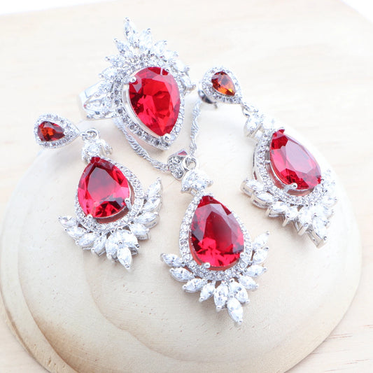 925 Silver Red Zircon Bridal Jewelry Sets Wedding Stones Bracelets Earrings Rings Pendant Necklace Set For Women
