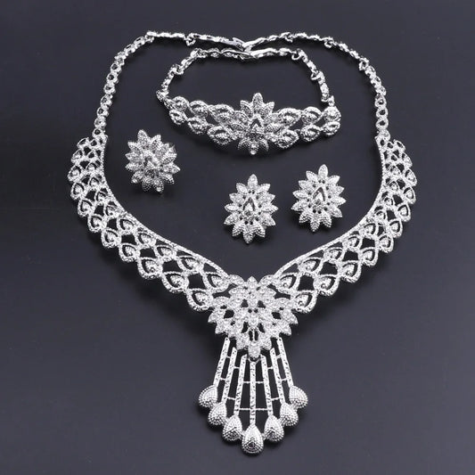 New Crystal Bridal Jewelry Sets Silver Plated Wedding Necklace Earrings Bracelet Ring African Beads Jewelry Sets Accessories