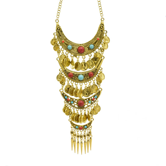 Multilayer Colorful Acrylic Gemstone Moon Coin Tassel Necklace Retro Ethnic Bib Long Rivet Pendant Choker Collar Gypsy Jewelry