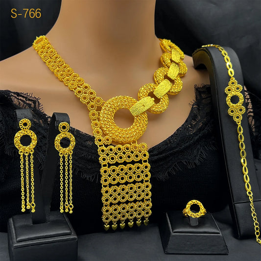 Dubai Gold Color Jewelry Set Bridal Indian Long Necklace Set Nigerian Choker Necklace Bracelet Earring Ring Sets