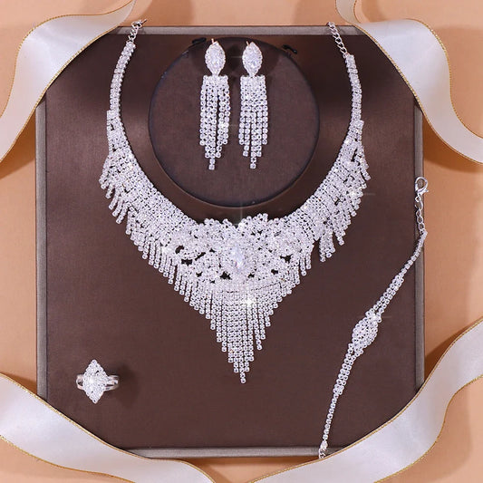 Silver Color Dubai Jewelry Set for Women Crystal Necklace Earrings with Bangle Ring