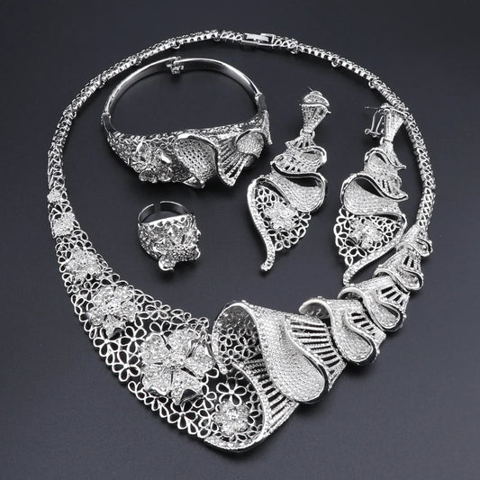 Luxury Dubai Silver Colour Jewellery Sets Necklace Bracelet Earrings Ring Set