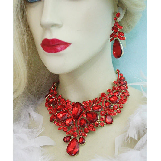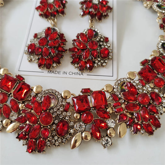 New Red Crystal Rhinestone Necklace Earrings Women Jewelry Sets