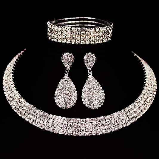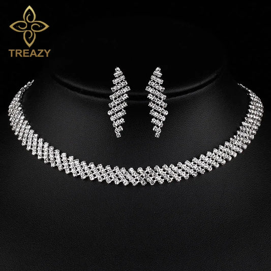 Luxury Crystal Bridal Jewellery Sets Silver Colour Rhinestone Choker Necklace Earrings Bracelet
