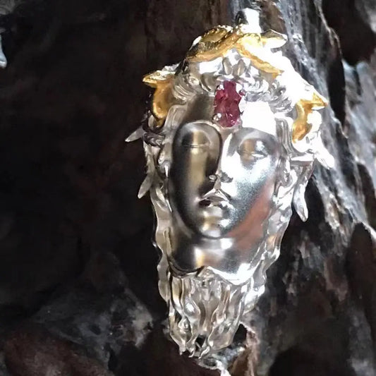 Silver Plate 18k Gold Midusa Pendlet Character Romathyx Art Original Design Inlaid Red Turmaline Pendlet