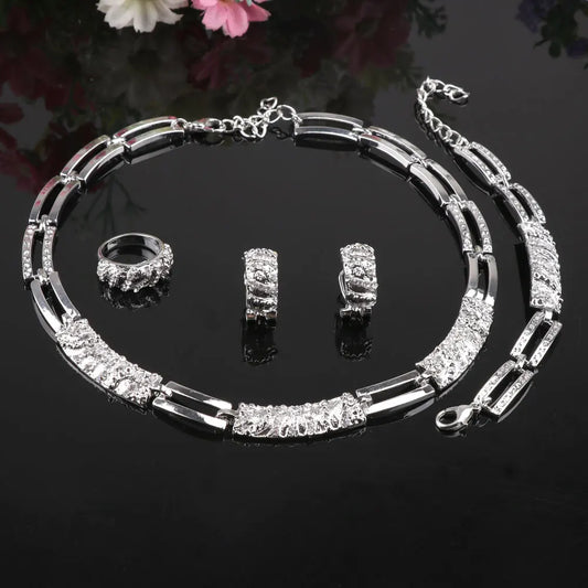 Silver Colour Jewellery Sets Crystal African Beads Necklace Earrings Ring Bracelet Set