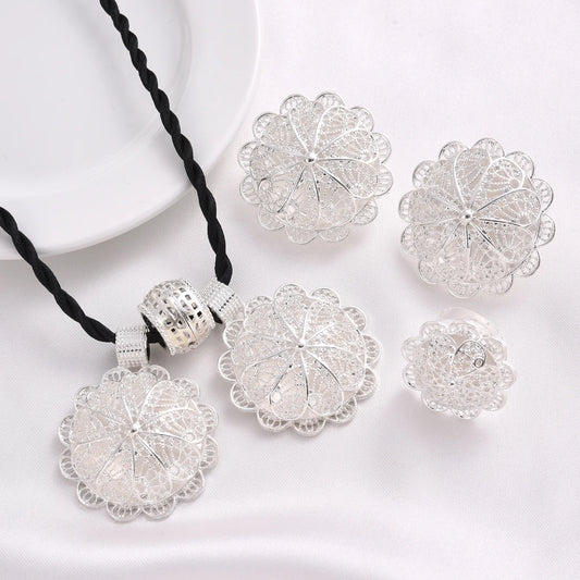Silver Color Bridal Jewelry Sets Women Ethiopian Pendant Hairpin Necklace Earrings Bangle Ring Arab Wedding Party Gift