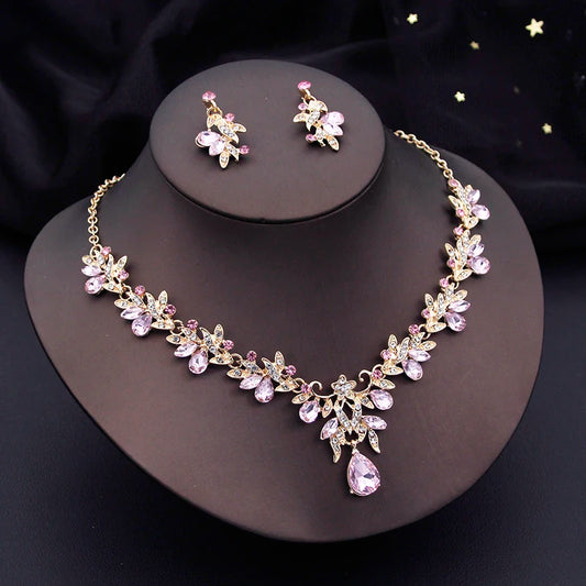 2 pcs set Flower Pink AB crystal bridal wedding jewellery sets dangle earrings and necklace sets