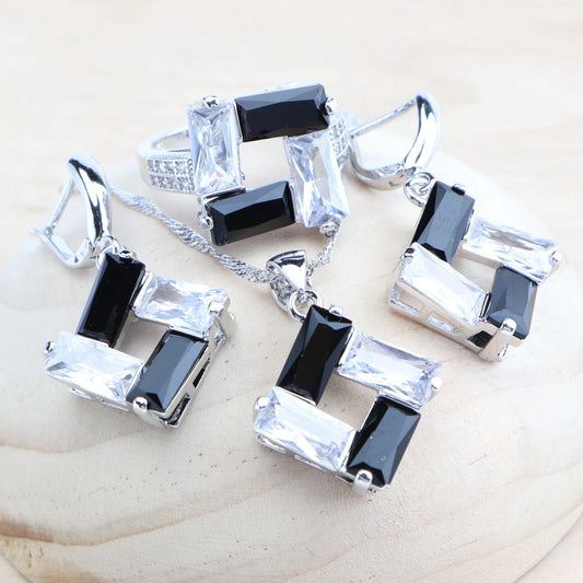 Silver Jewellery Sets Bridal Black White Zircon Earrings Rings Pendant Necklace Stone Bracelets Set