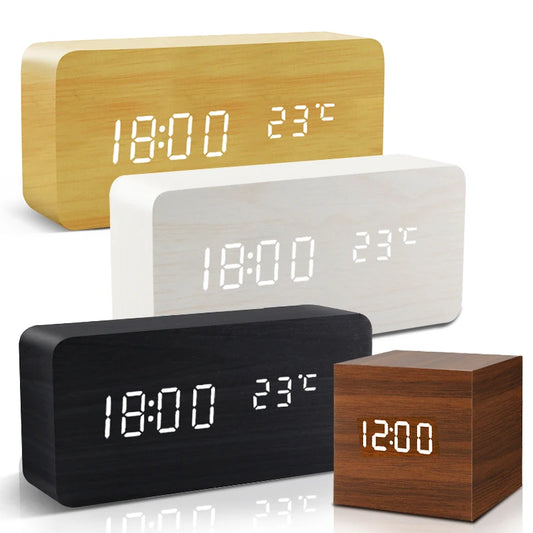 Wooden Digital Clock Multi-function LED Alarm Clock with Time/ Date/ Temperature Display and Voice Control for Home Office Trave