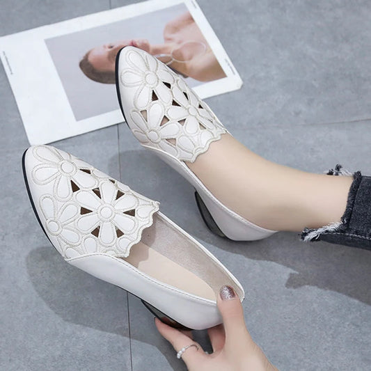 Shoes for Women Embroidery Breathable Square Heel Loafers Slip On Pointed Toe Leather Single Shoes