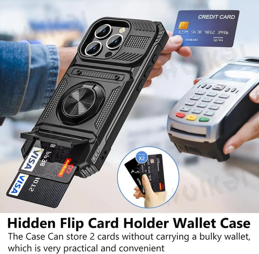 Case For iPhone 16 Pro Max 15 Pro 15 Pro Max 14 Card Holder Magnetic Rotated Ring Kickstand Layer Heavy Shockproof Wallet Covers