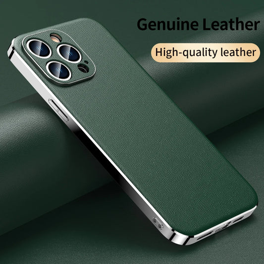 Genuine Leather Phone Case for iPhone 16 15 11 12 13 14 Pro Max Luxury Plating Shockproof Lens Protection Back Cover