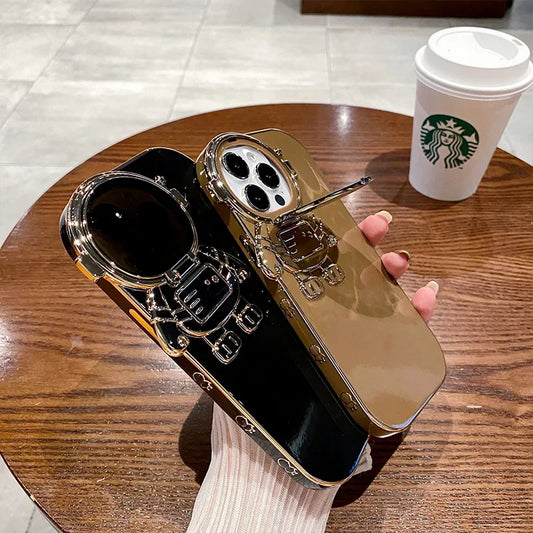 Cute Cartoon Astronaut Glitter Case For iPhone 14 13 12 15 16 Pro Max Plus 11 Bracket Gradient Plating Stand Transparent Cover