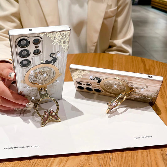 Flash diamond butterfly magnetic phone case for Samsung Galaxy S24 S23 S22 Ultra Plus magsafe charging ring holder hard cover