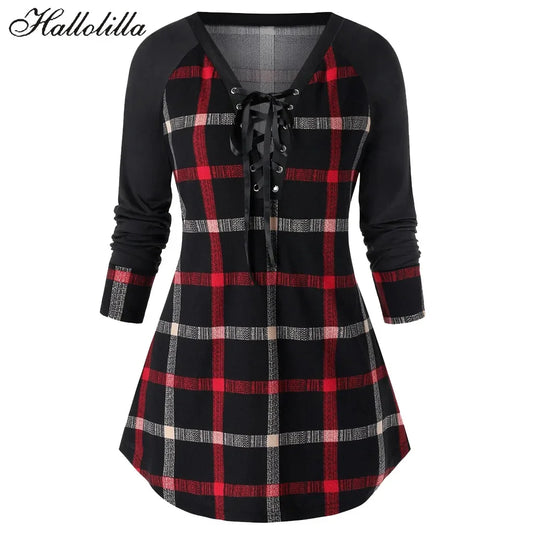 Women's Long T Shirt Casual Female Plaid T-Shirts Woman Clothing Tops