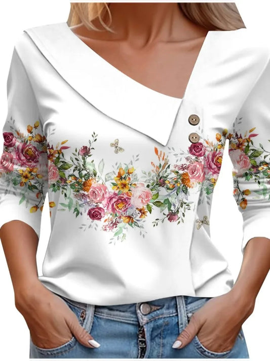 Cute Long Sleeve Floral Print Deep V Neck Tops for Women Hot Selling Trendy T Shirts