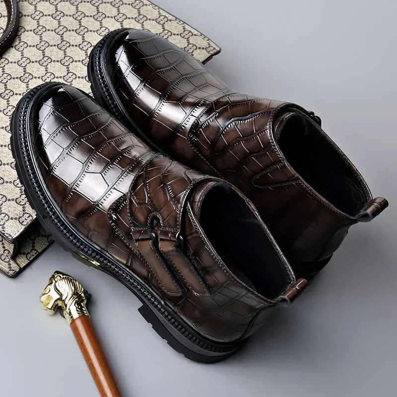 Autumn Winter Buckle Designer Ankle Boots for Men Stone Pattern Leather Shoes Male Fashion Casual British Style Chelsea Boot Man