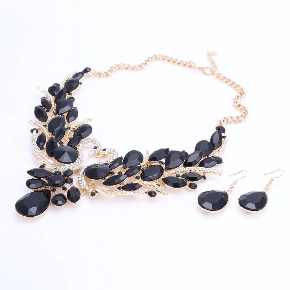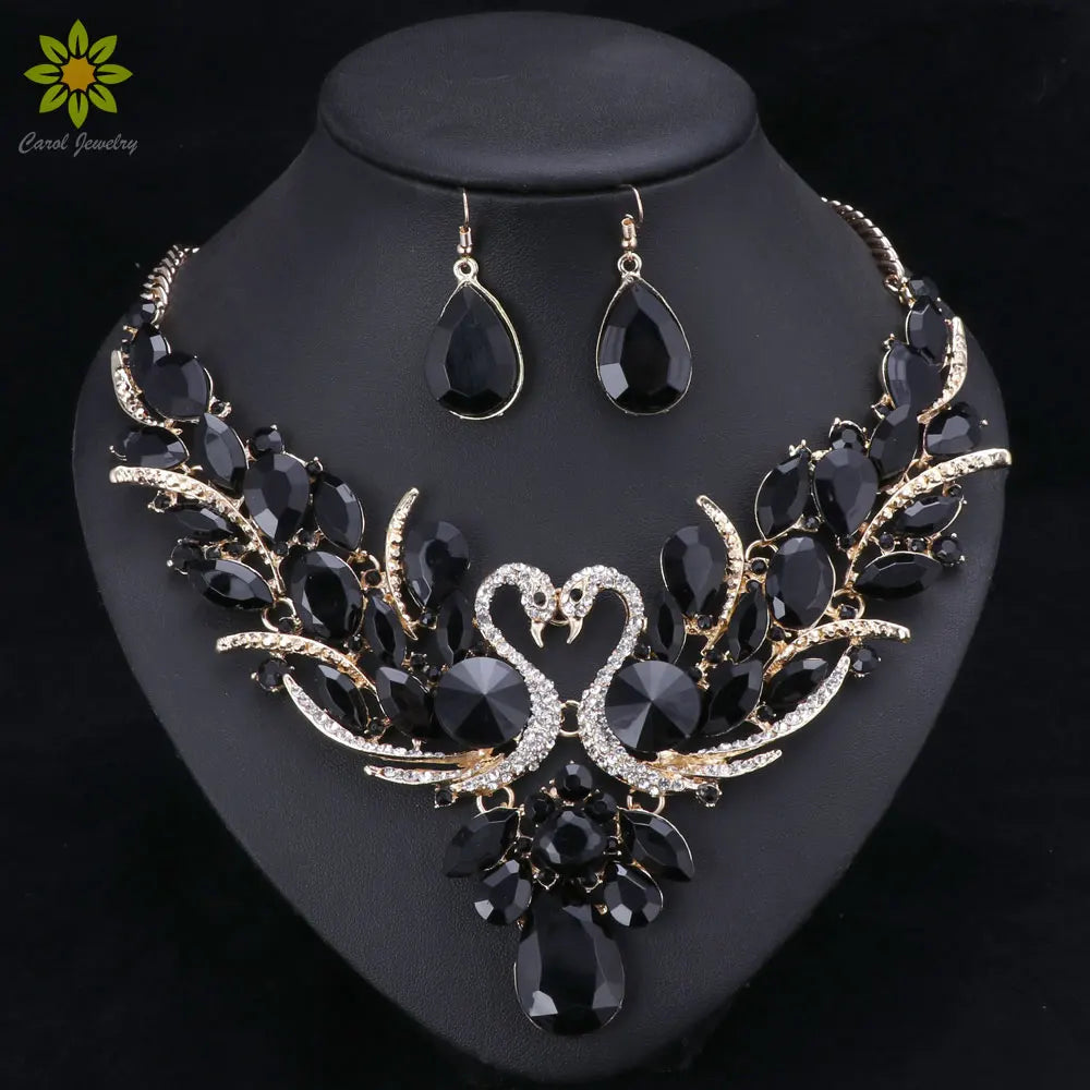 Black Crystal Bridal Jewelry Sets Gold Color Swan Pendant Necklace Women Gift Party Wedding Prom Necklace Earring Accessories