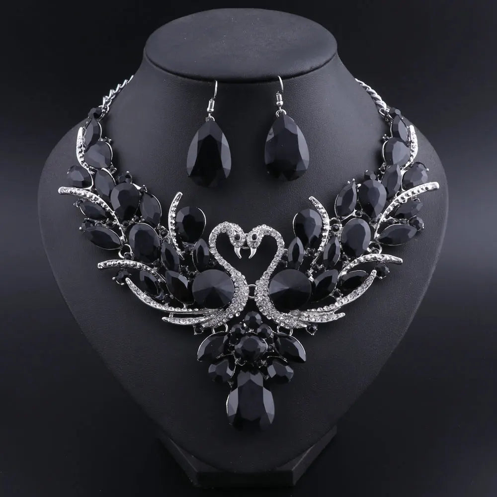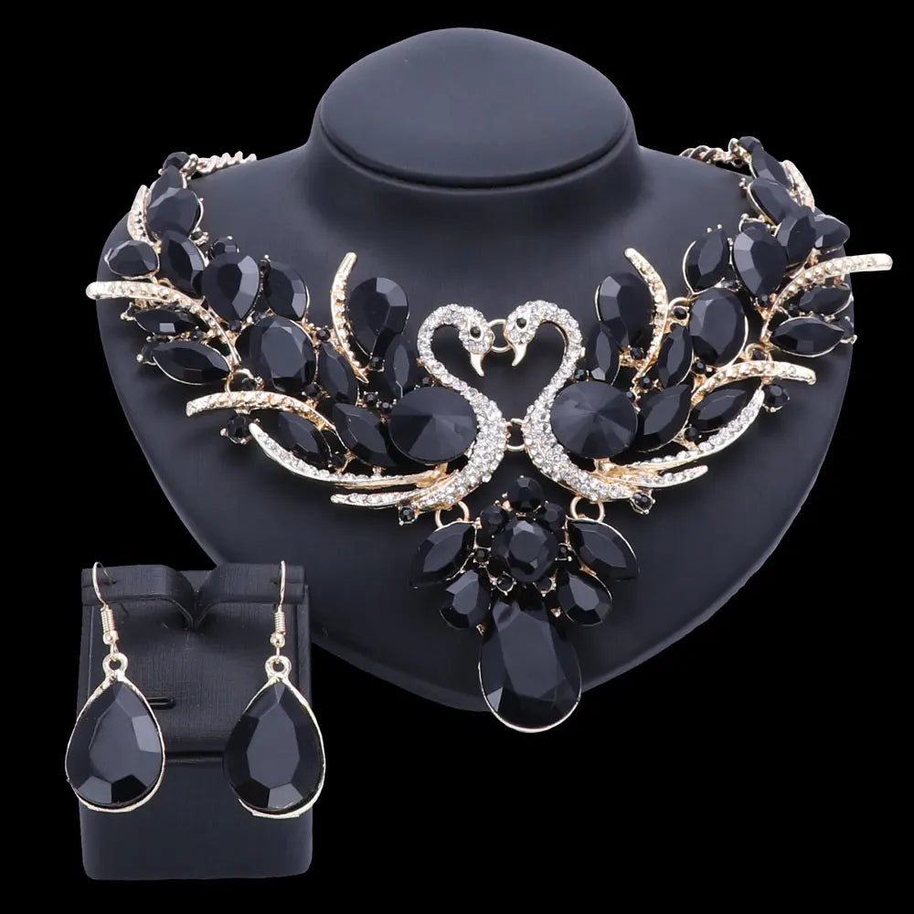 Black Crystal Bridal Jewelry Sets Gold Color Swan Pendant Necklace Earring set