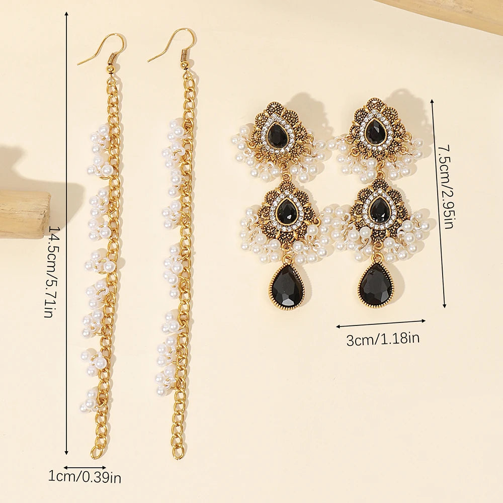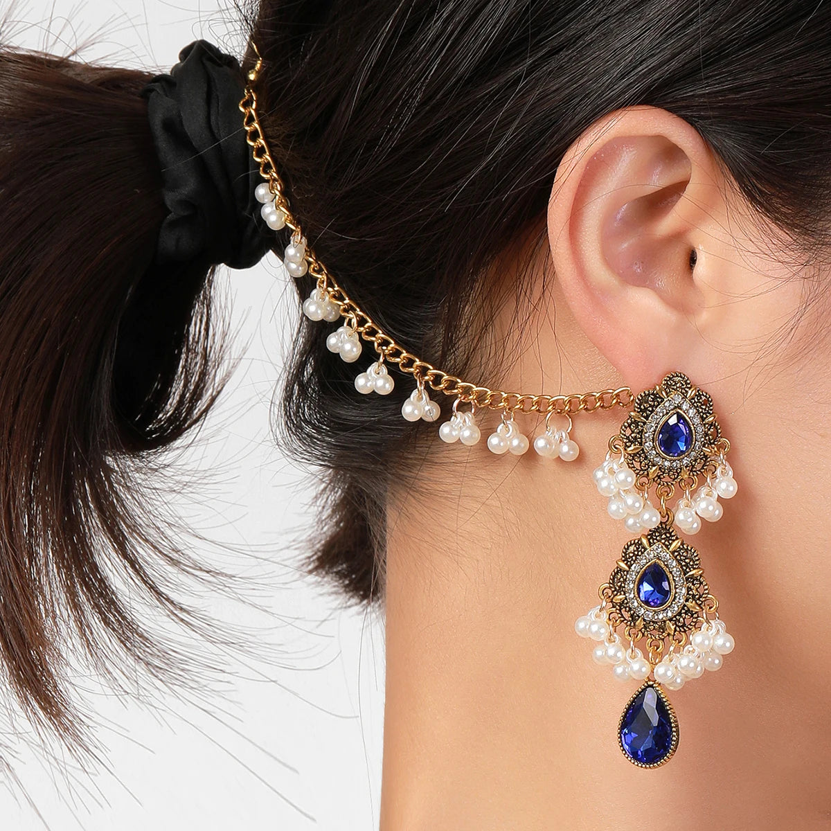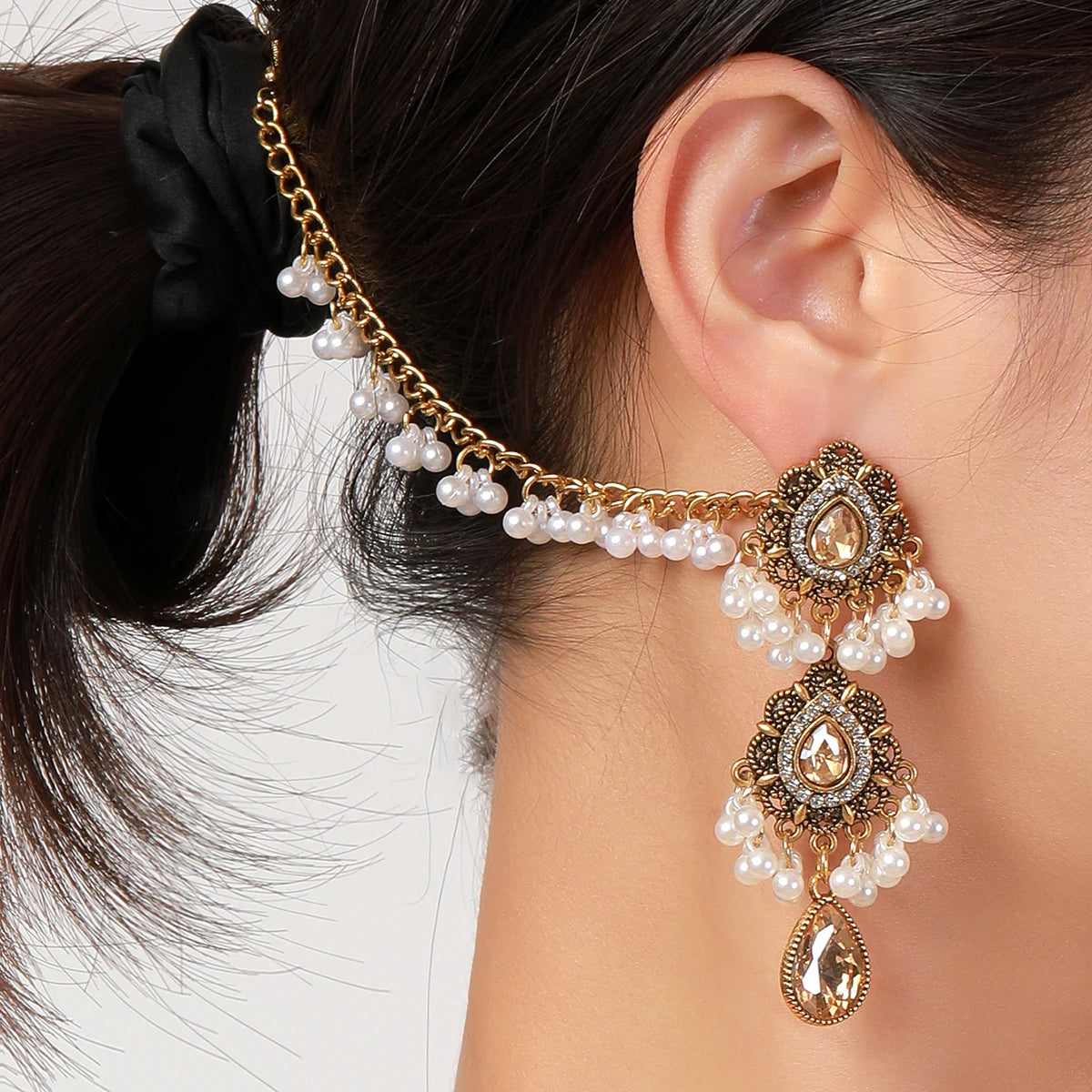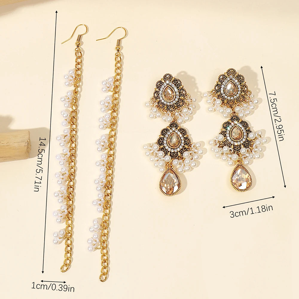 Boho Water Drop Long Earrings Headdress for Women Luxury Crystal Pearl Tassel Wedding Jewellery