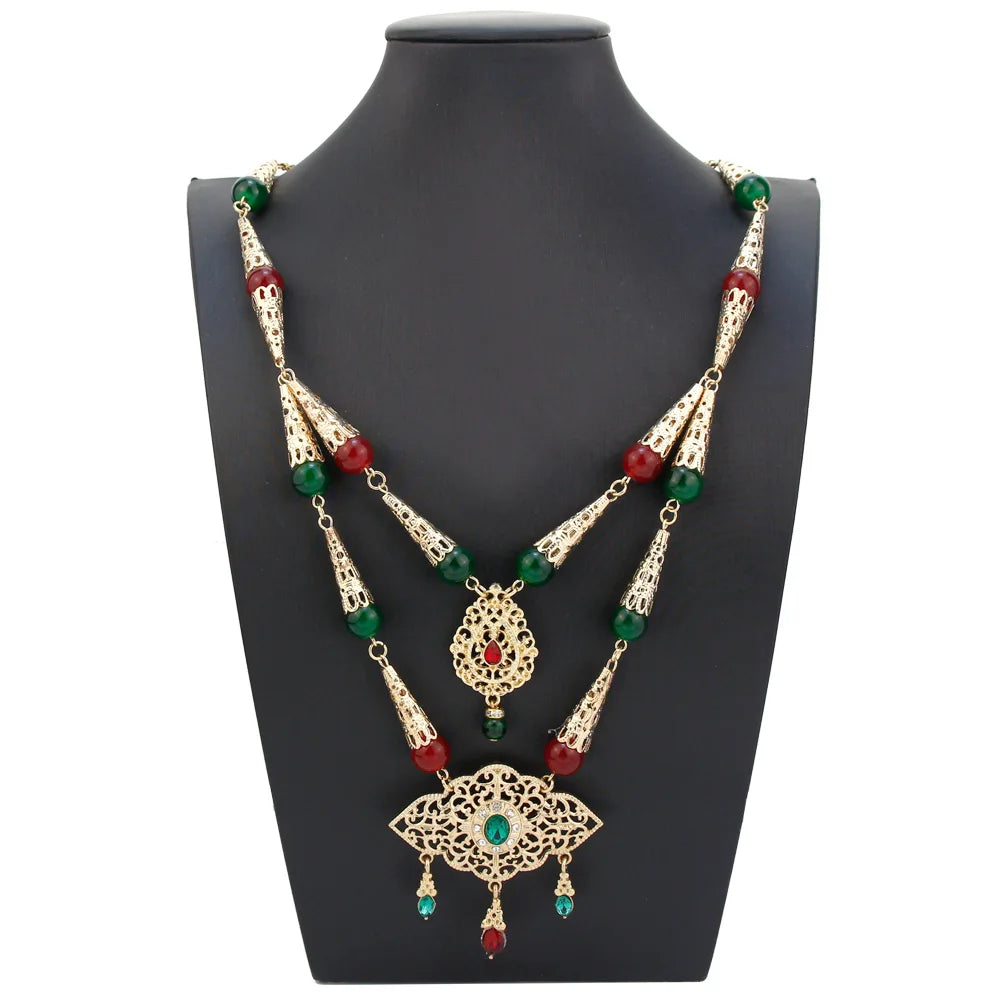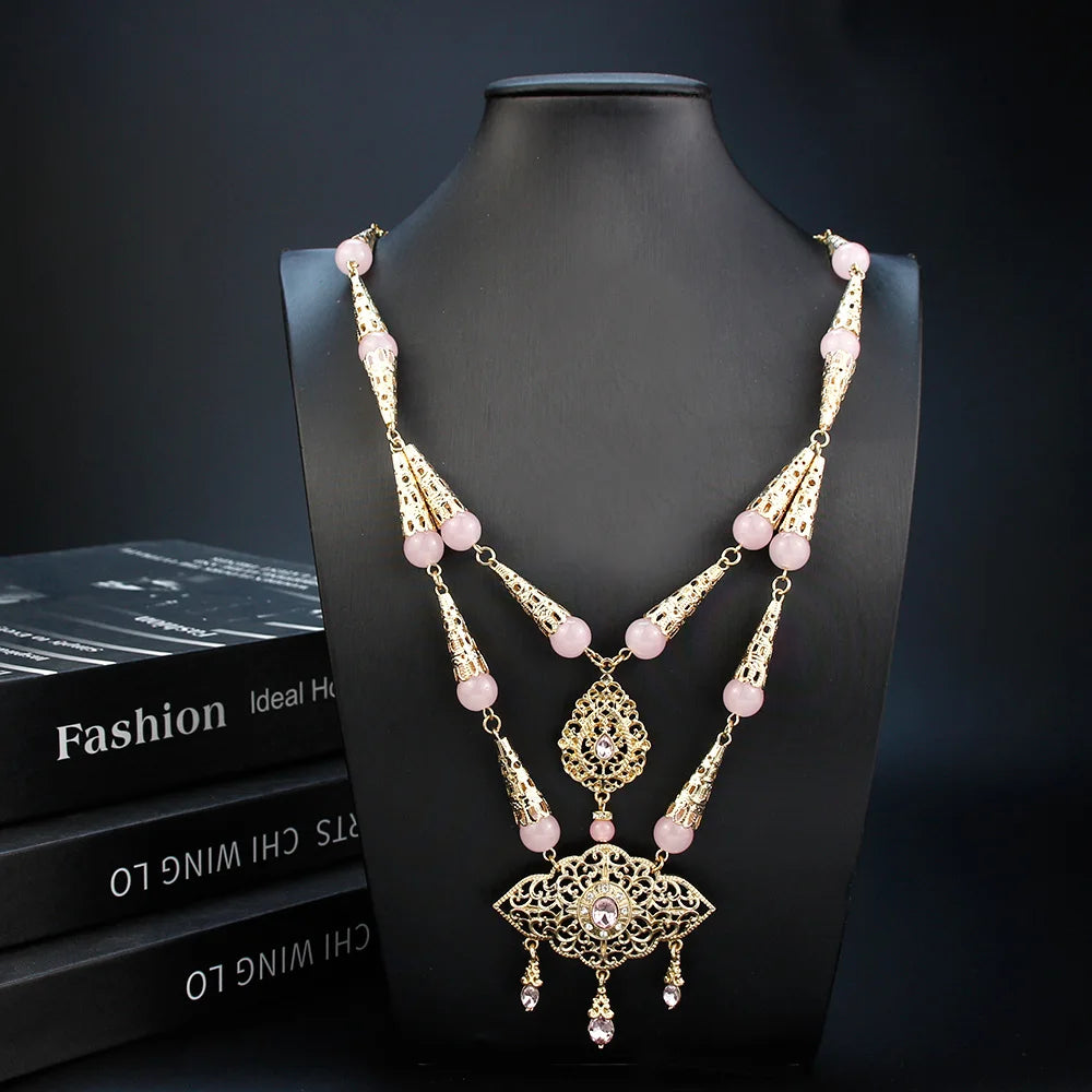 Chic Arabic Double Chain Necklace Round Stone Beaded Necklace Flower Pendant Gold Color Morocco Bride Wedding Jewelry