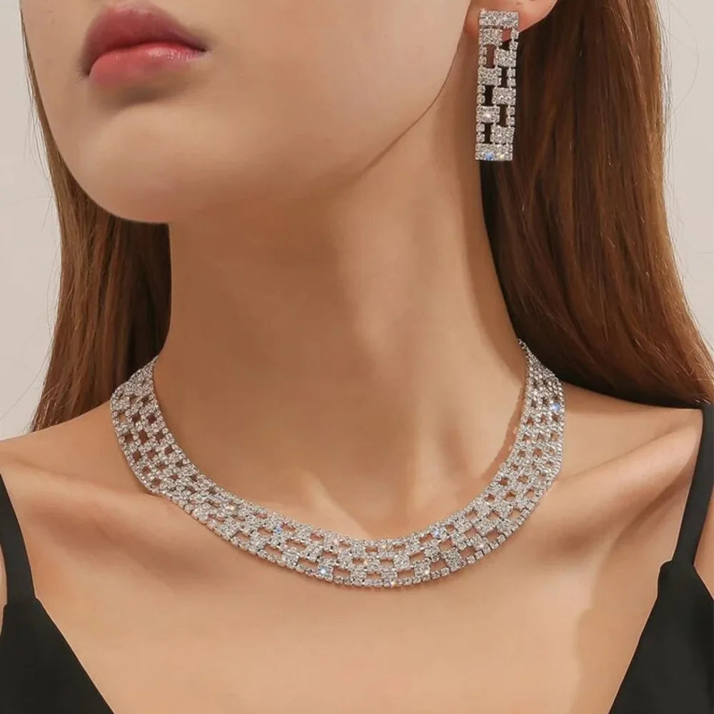 Elegant Hollow Rhinestone Elegant Jewellery Sets Dress Accessories 2024 Nigerian Wedding Necklace Earrings Set for Women Party