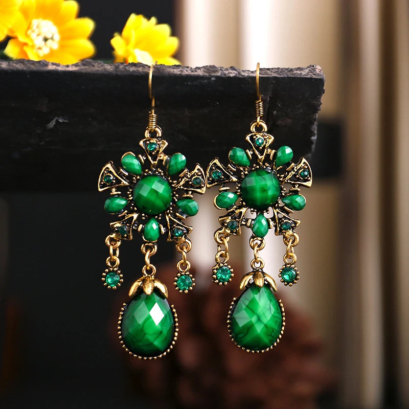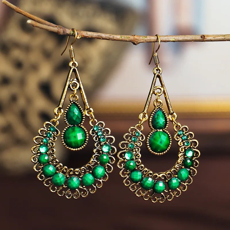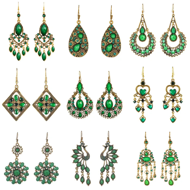 Ethnic Style Green Rhinestone Water Drop Earrings for Women Retro Gold Color Geometric Dangle Earrings Pendientes Mujer Boho