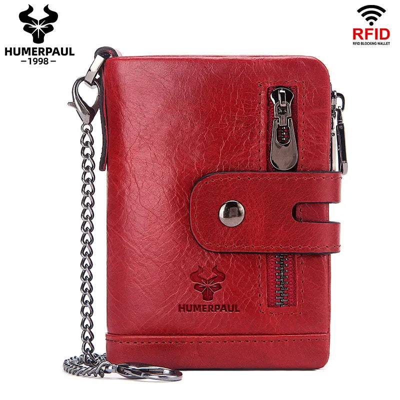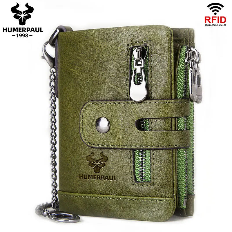 HUMERPAUL100% Genuine Cowhide Leather Wallet For Men Short RFID Money Purse Card Holder Double Zipper Bifold Coin Pocket