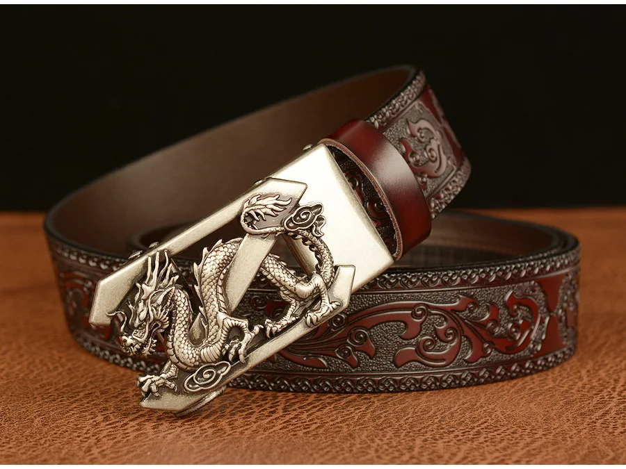 BOKADIAO Men Genuine Leather Belt Luxury Gold Dragon Metal Automatic Buckle Cowhide Belts for Men Jeans Waistband Male Strap