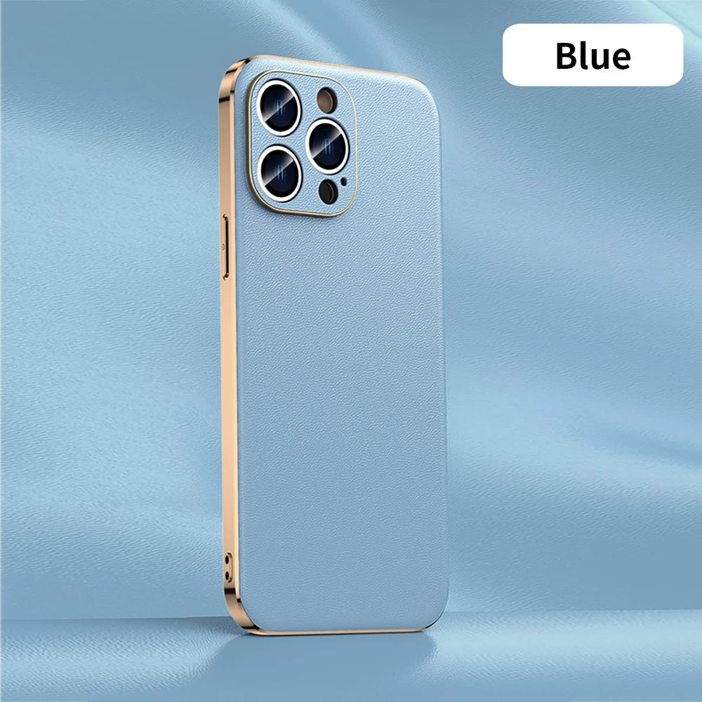 Genuine Leather Phone Case for iPhone 16 15 11 12 13 14 Pro Max Luxury Plating Shockproof Lens Protection Back Cover