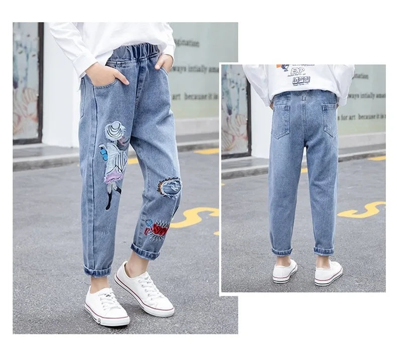 Girls Jeans spring autumn Korean Wild Loose cartoon print Elastic Waist Straight Thin Wide-leg