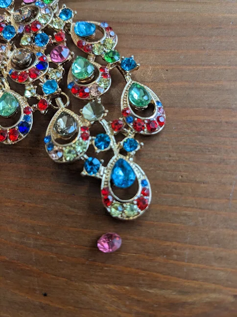 Beautiful piece, but it was shipped with no protective bubble wrap, and a rhinestone fell out of the tail.