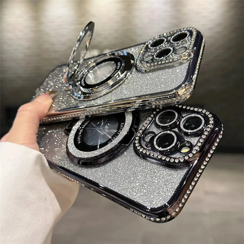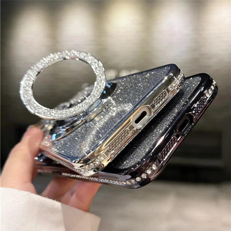 Luxury Plating For Magsafe Magnetic Stand Holder Glitter Diamond Case For iPhone 16 15 11 12 13 14 Pro Max Soft Silicone Cover