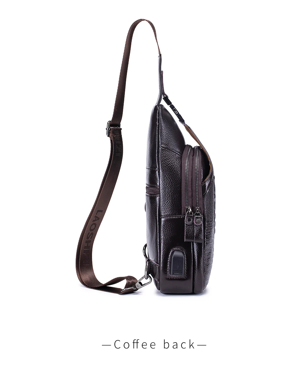 Men's leather chest bag, crossbody bag, crocodile pattern multifunctional bag with USB charging shoulder bag