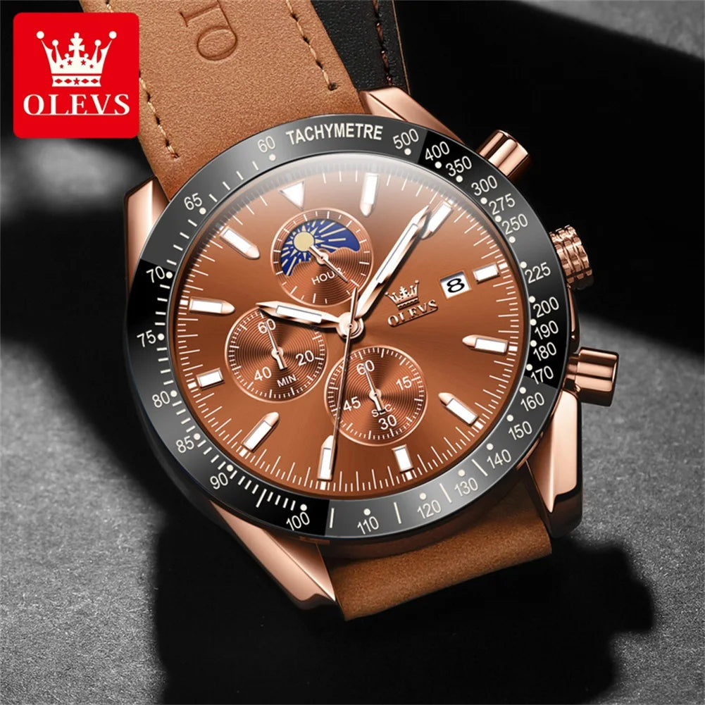 OLEVS Original Men's Quartz Watch Brown Leather Strap Moon Phase Waterproof Multifunctional Luxury Brand Watch for Men 2024 New