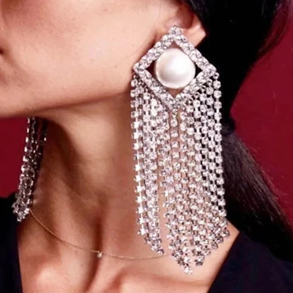 Pearl Long Tassel Earrings With Silver Needle Crystal Rhinestone Sparkling Party Accessories