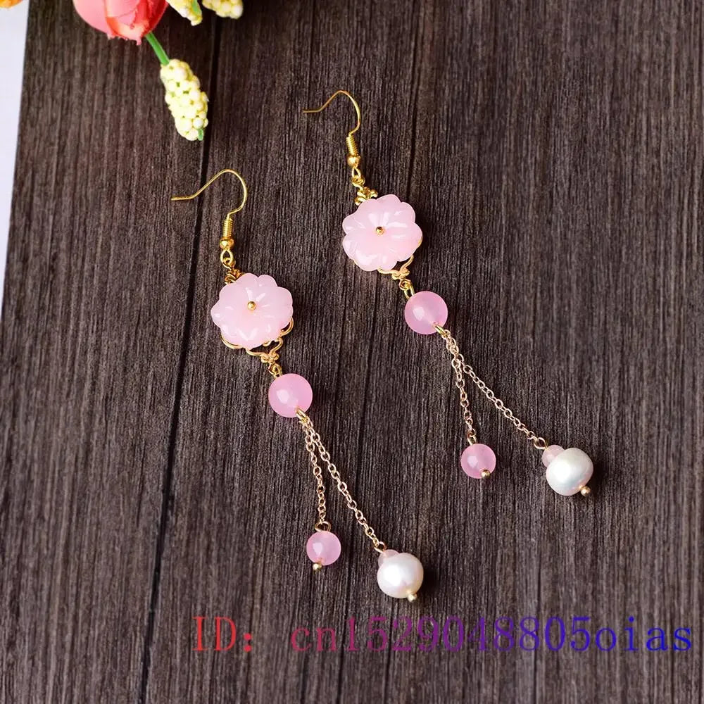 Pink Jade Flower Earrings Chalcedony Gemstone Charm Crystal Jewelry