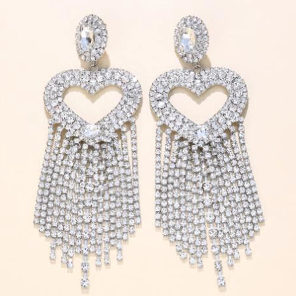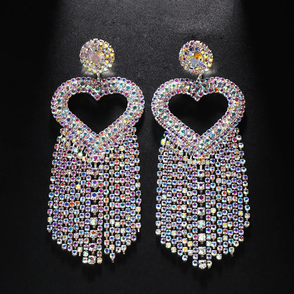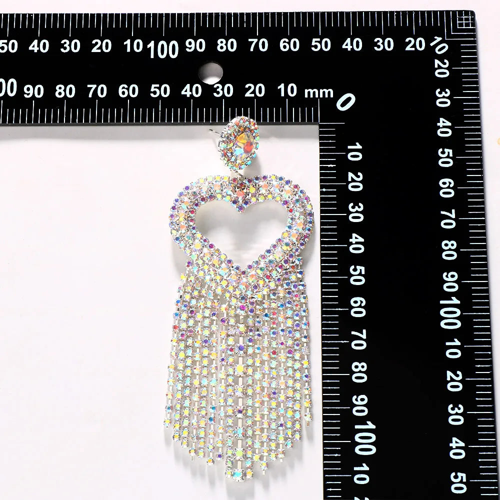 Rhinestones Heart Hollow Tassel Dangle Earrings for Women Crystal Show Long