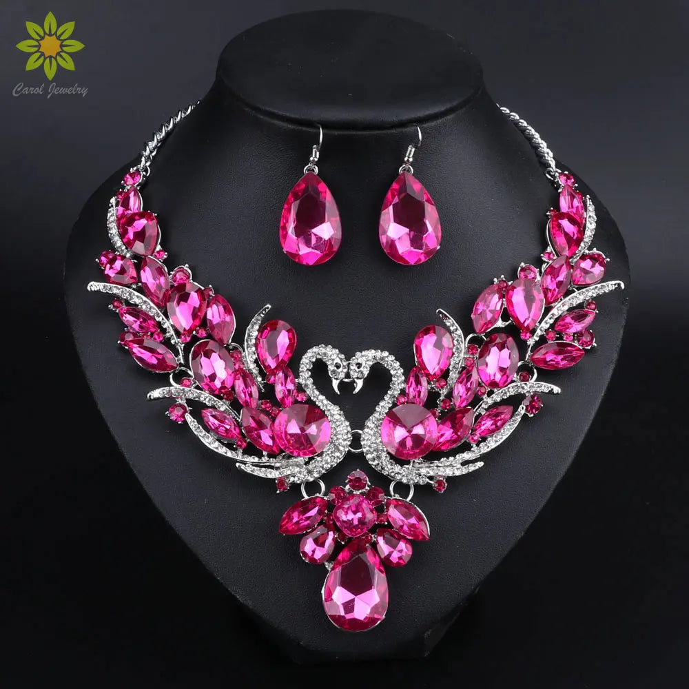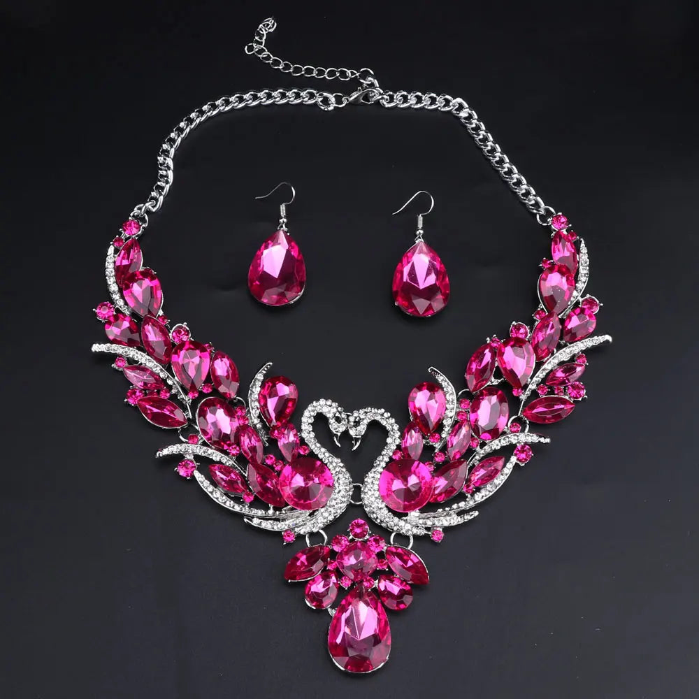 Rose Red Crystal Bridal Jewelry Set For Brides Swan Pendant Necklace Earrings Set Wedding Party Costume Accessories Women