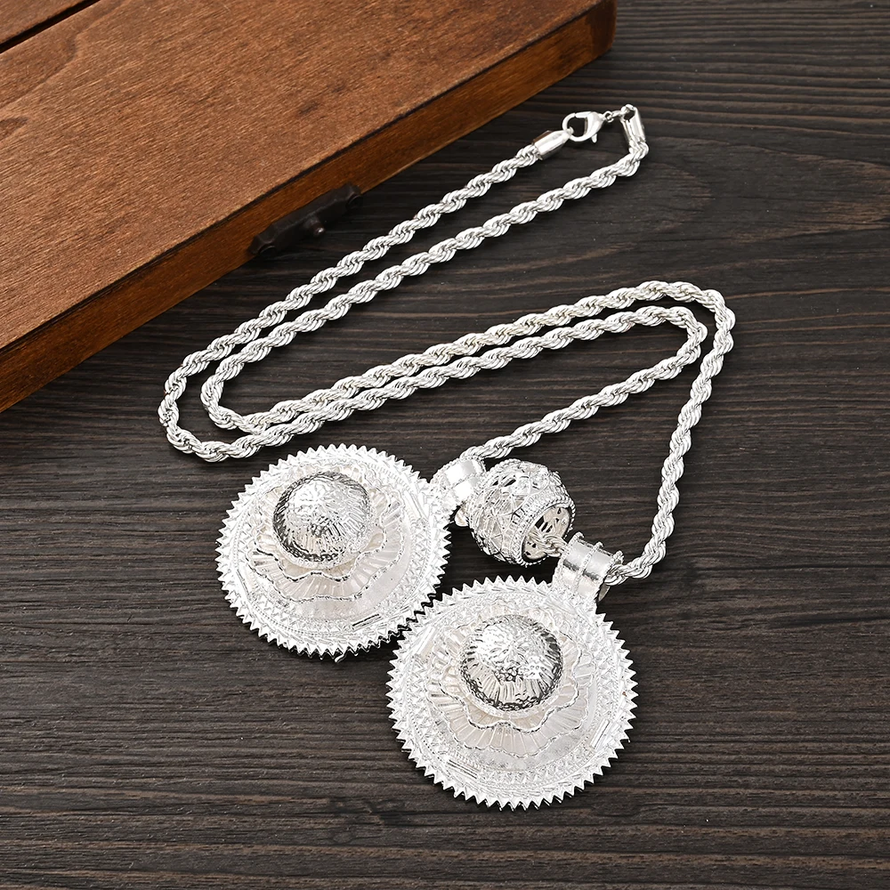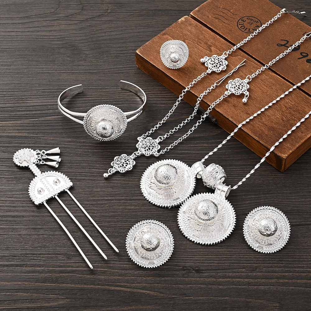 Luxury Silver Plated Bridal Jewelry Sets for Women Ethiopian Pendant Hairpin Necklace Earrings Bangle Ring Wedding Gift