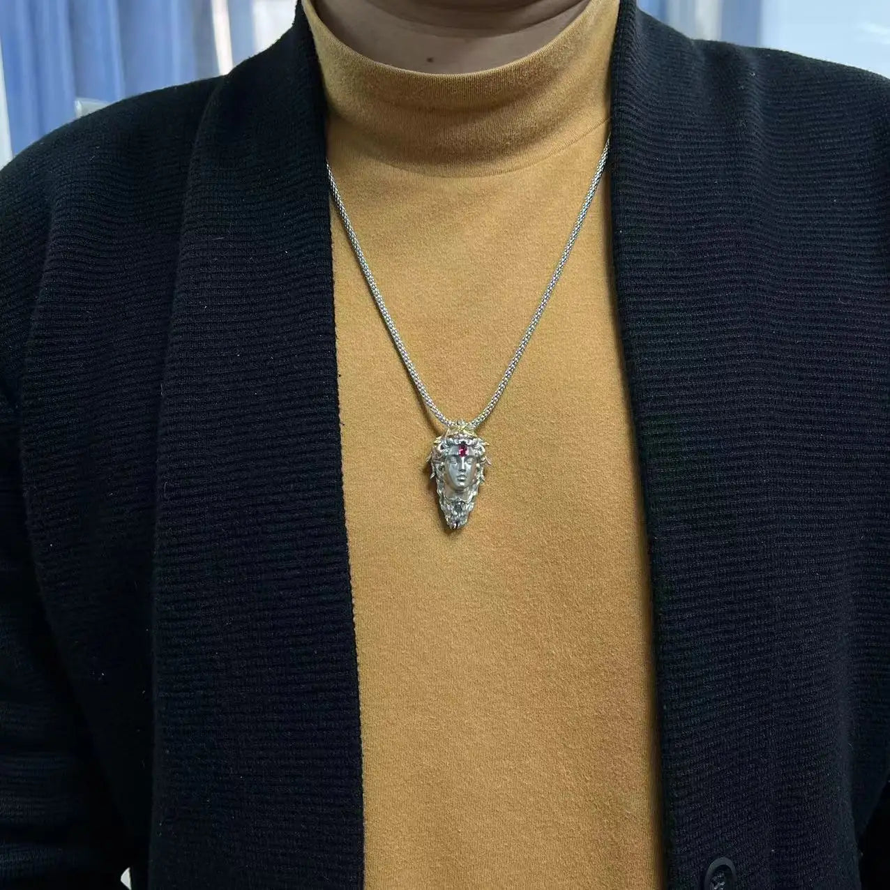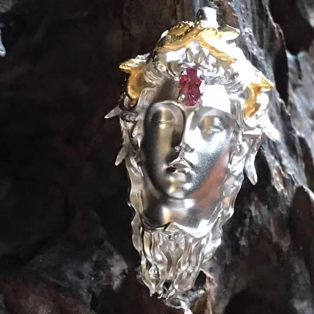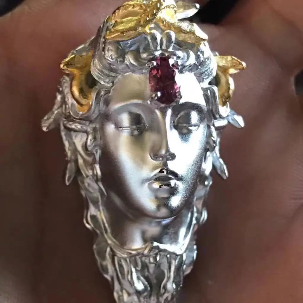 925 Silver Plate 18k Gold Midusa Pendlet Character Romathyx Art Original Design Inlaid Red Turmaline Pendlet