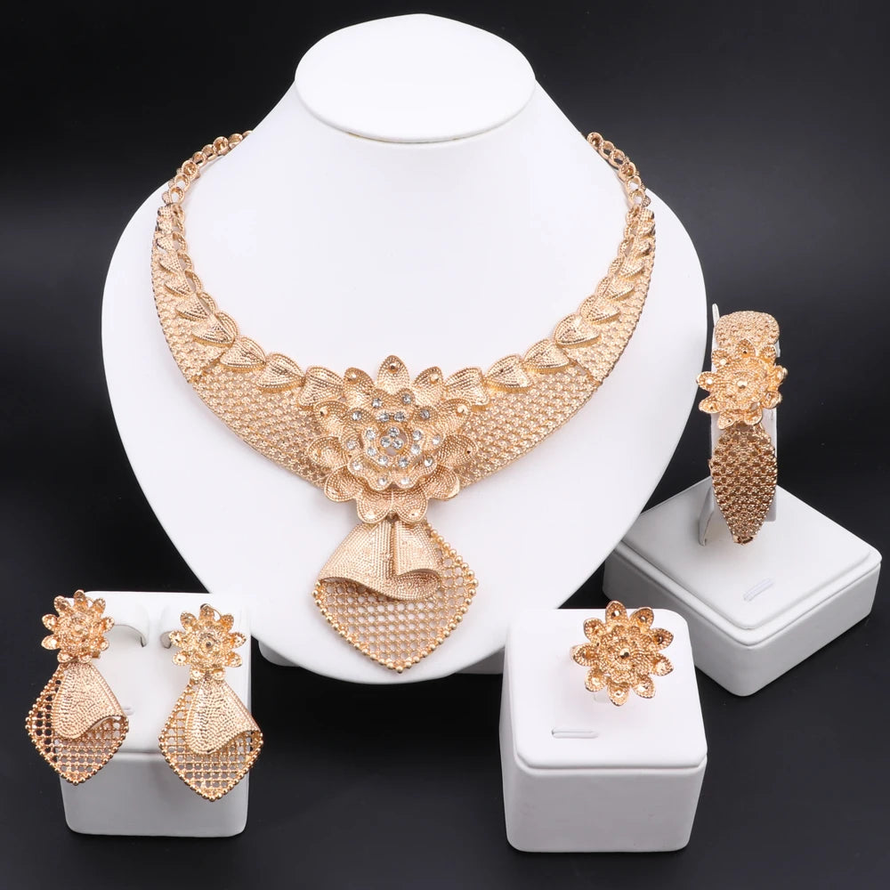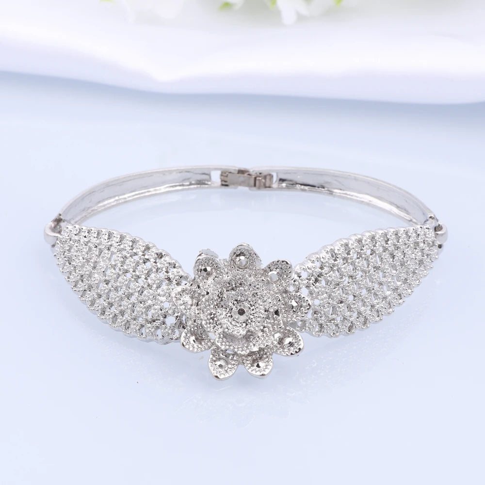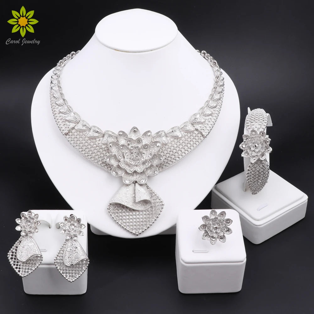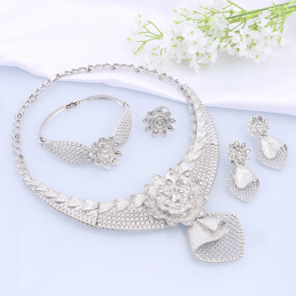 Silver Plated Jewelry Sets for Flower Shaped Women Necklace Earrings Bracelet Ring Women African Beads Indian Bridal Jewelry Set